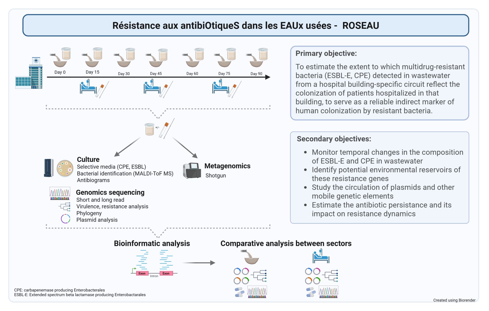 Résumé du projet : le projet ROSEAU (Résistance aux antibiOtiqueS dans les EAUx usées) vise à évaluer si les bactéries multi-et hautement résistantes (BMR/BHR) retrouvées dans les eaux usées d'un circuit spécifique à un bâtiment hospitalier (service des maladies infectieuses et tropicales de l'hôpital Bichat) reflètent la colonisation des patients hospitalisés dans ce bâtiment et peuvent ainsi constituer un marqueur indirect fiable de la colonisation humaine par des bactéries résistantes.