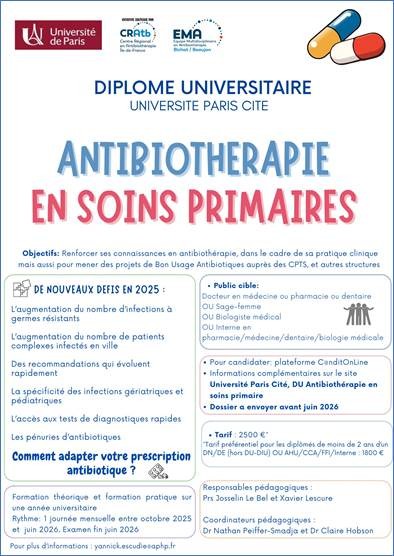 - Paris (Université Paris-Cité) : "DUASP Antibiothérapie en soins primaires" Affiche 2025-2026